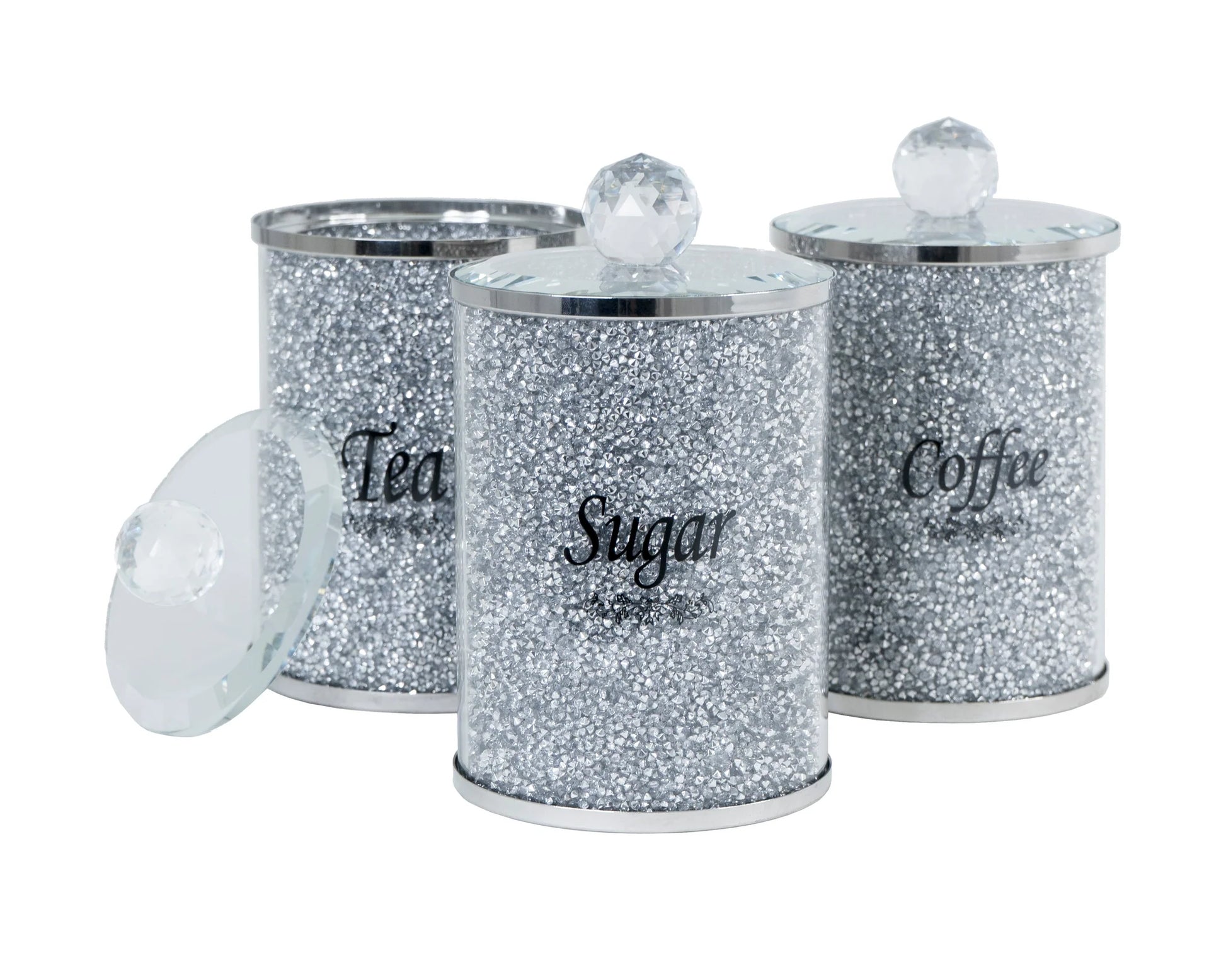 Eye-catching kitchen canister set decoration filled with embellished stones and that will be a stylish statement on a kitchen shelf, dining table, bar or counter top. These beautiful accessories double as a functional piece and decorative accent bringing a modern touch to any home.