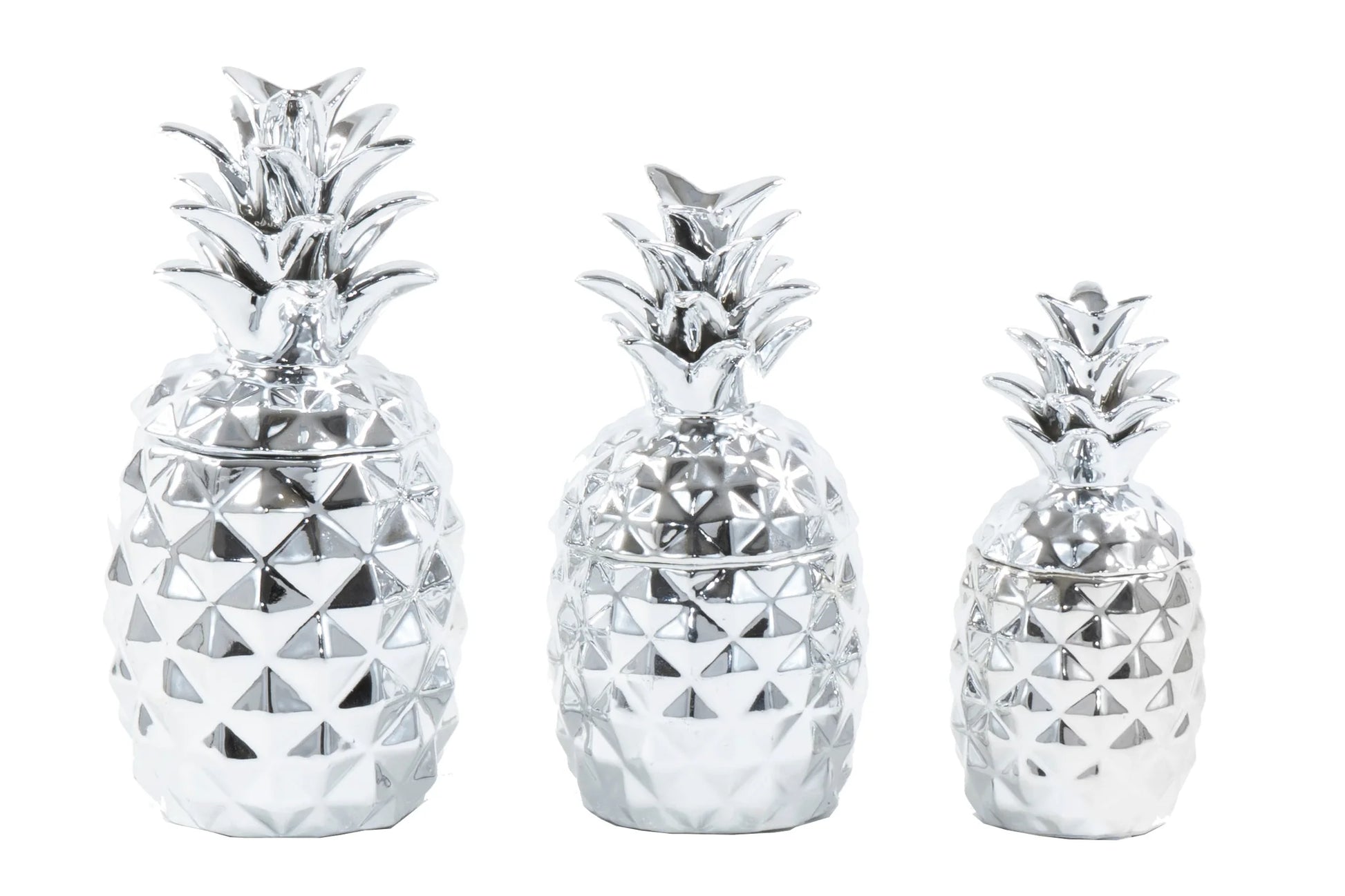 Welcome your guests into your home with this silver three piece modern canister set of pineapples in your home. Pineapples represent hospitality and welcoming. This canister set will be an exquisite choice to bring into any kitchen. Made with the highest grade ceramic and finished with a fine silver glaze.