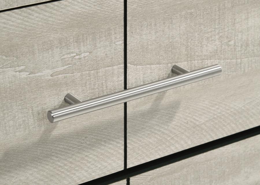 | This four-drawer chest offers a stylish combination of rustic charm and modern design, making it a perfect storage solution for contemporary bedrooms. Finished in a rustic cream with rough-sawn, white-washed engineered paper veneer, it has a warm, textured appeal that’s both inviting and chic. The extra-wide polished nickel handles add a sleek, modern touch, creating a subtle contrast. Built with engineered wood, the chest features English dovetail joinery and Center metal glides for durability and smooth functionality, ensuring it meets both aesthetic and practical needs. |